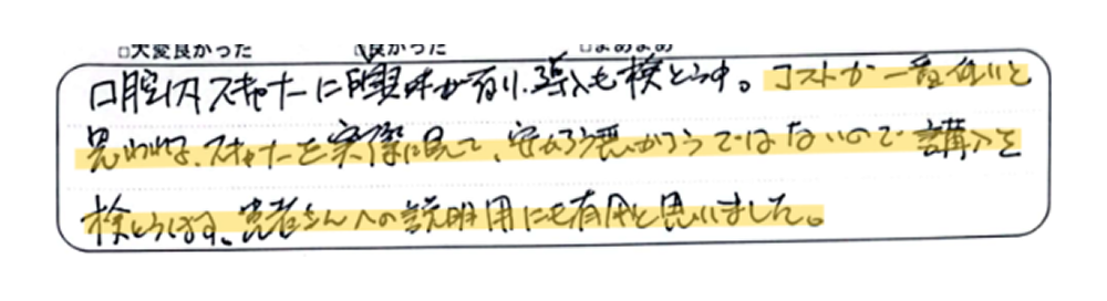 口腔内スキャナーに興味があり、導入も検とう中。コストが一番低いと思われる、スキャナーを実際に見て、安かろう悪かろうではないので購入を検とうします。患者さんへの説明用にも有用と思いました。