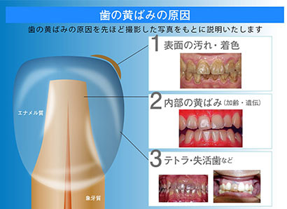 シミュレーションシステムの特徴は、クライアント自身の撮影画像を用いて、ホワイトエッセンス に継続来院することで、口元と口腔内が健康的によくなる未来だけではなく、通わないことで、悪くなる未来もシミュレーションできる点にあります。ホワイトニング以外にも、歯列矯正、クリーニングの他、様々な歯科メニューのシミュレーションが可能です。